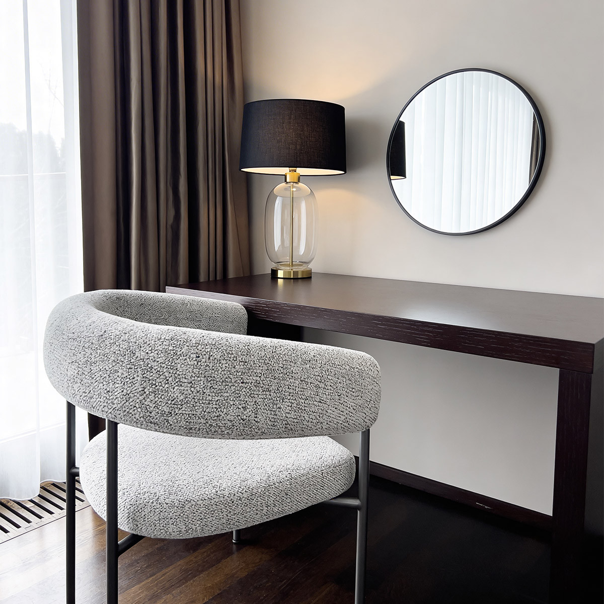 Kontrasty odgrywają ważną rolę we współczesnych trendach wnętrzarskich, a duża lampa stołowa Amur stanowi ich doskonały przykład. Pełne sprzeczności jest już bowiem samo zestawienie transparentnego szkła i złotego metalu z tekstylnym kloszem. Dolna część lampy wygląda jak elegancki wazon o obłym kształcie. Przezroczysta bańka idealnie komponuje się z metalowymi elementami utrzymanymi w kolorze szczotkowanego złota. W rezultacie elegancka lampa stołowa z abażurem nie ogranicza się jedynie do swojej pierwotnej funkcji, lecz działa jednocześnie jako efektowna dekoracja, która dodaje aranżacji pazura. Nie można jednak zapomnieć, że jest to lampa stołowa z czarnym abażurem wykonanym z tkaniny. Gęsty splot i ciemna barwa sprawiają, że przesączające się światło traci na intensywności. Zyskuje za to subtelnie przytłumioną barwę – tak pożądaną wtedy, gdy lampa jest włączana w nocy albo od razu po przebudzeniu. Lampa stołowa z przezroczystą podstawą, która cechuje się tak nieoczywistą i trudną do jednoznacznego sklasyfikowania estetyką, może z powodzeniem stanąć w niemal każdym pomieszczeniu, niezależnie od zastosowanego w nim motywu przewodniego. Metaliczny połysk złota pasuje m.in. do wnętrz glamour, art déco czy vintage. Tekstylny klosz w czarnej barwie to z kolei dobry dodatek do aranżacji klasycznych i nowoczesnych. Unikalna konstrukcja klosza sprawia, że wymiana żarówki jest prosta. Wkręca się ją od góry bez konieczności demontowania żadnego elementu lampy. Solidna, szeroka podstawa dodaje modelowi stabilności. Lampa ma miejsce na tylko 1 żarówkę. Aby uzyskać efekt skuteczniejszego doświetlenia konkretnego fragmentu wnętrza, warto ułożyć symetryczną kompozycję z 2 lamp stołowych Amur.