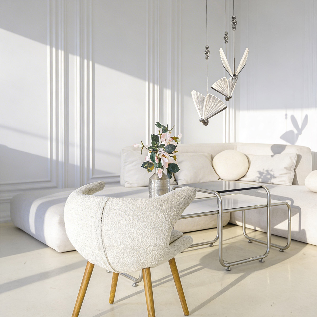 Lampy Mariposa wyróżniają się niepowtarzalnym designem, posiadając klosze w kształcie motyli, które są prawdziwą ozdobą każdego wnętrza. Światło LED, subtelnie umieszczone w skrzydłach, tworzy delikatny i elegancki efekt świetlny. Chromowane elementy z metalu harmonijnie współgrają z lśniącymi skrzydłami, dodając lampie nowoczesnego i stylowego charakteru. Ta starannie zaprojektowana lampa nie tylko oświetla przestrzeń, ale także wnosi do niej wyjątkową atmosferę spokoju i harmonii, tworząc ciepłą i przytulną aurę. Lampy Mariposa to niezastąpiony element dekoracyjny, który doskonale uzupełnia zarówno nowoczesne, jak i klasyczne aranżacje wnętrz.