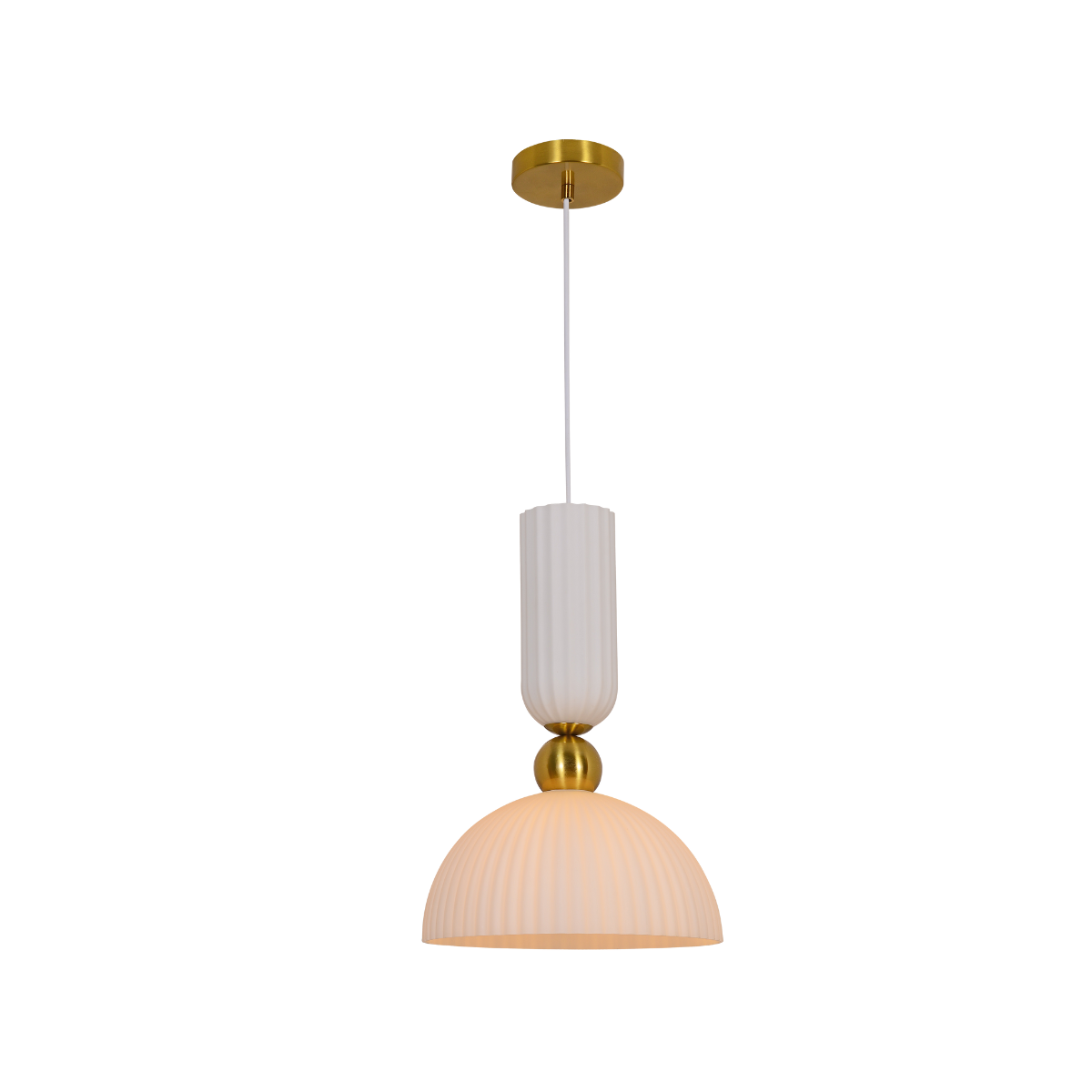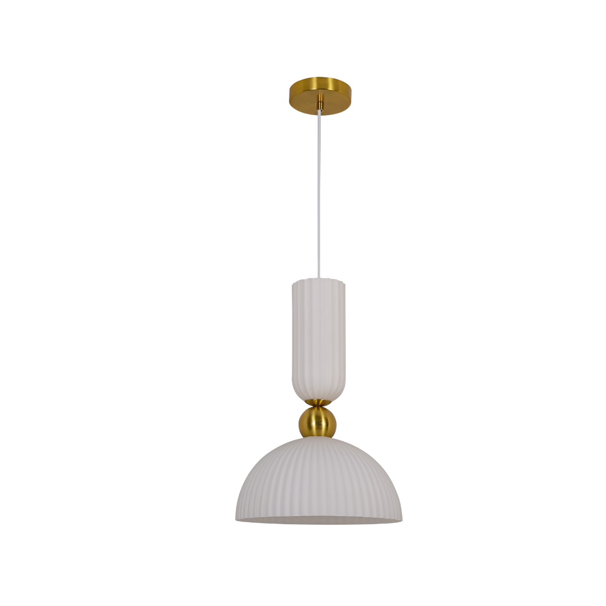 Piega white to stylowa lampa wisząca o dekoracyjnym charakterze, która doskonale łączy klasyczną formę z nowoczesnym wykończeniem. Ryflowany, szklany klosz w białym kolorze delikatnie rozprasza światło, zapewniając przytulną atmosferę i elegancki efekt wizualny.