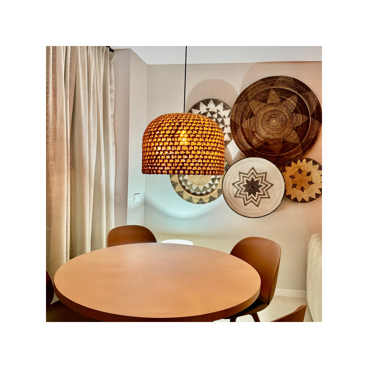 Lampa wisząca Kanso doskonale wpisuje się w skandynawską aranżację, w której dominuje jasna kolorystyka, naturalne materiały i prostota form. Wykonany z naturalnego sznurka i rattanu klosz dodaje wnętrzu ciepła i przytulności, a jego ażurowa struktura subtelnie rozprasza światło, tworząc przyjemną atmosferę. W połączeniu z drewnianymi meblami, plecionymi dodatkami i delikatnymi dekoracjami lampa podkreśla minimalistyczny, ale przytulny charakter przestrzeni. To idealny wybór dla miłośników stylu skandynawskiego, którzy cenią naturalne piękno i funkcjonalny design.